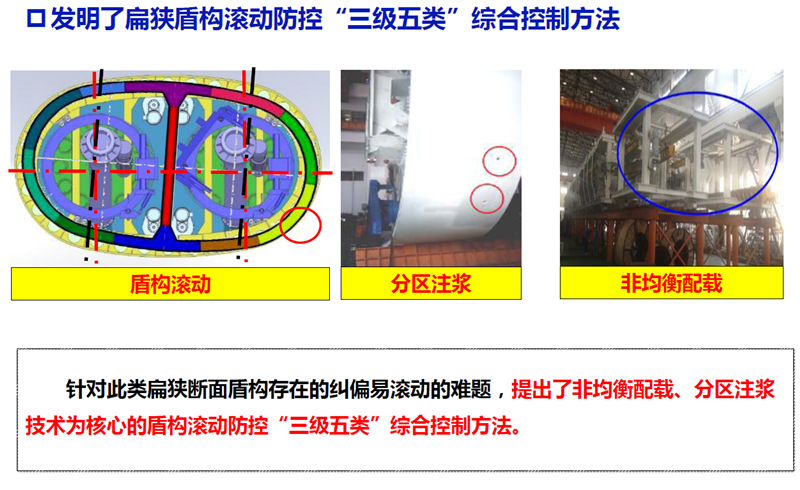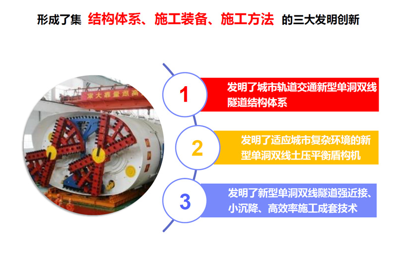 围绕“强化地层沉降控制能力”这一城市核心区施工的关键要求,发明了具有“双X同面+偏心多轴”刀盘系统、串联环臂式轨迹跟踪管片拼装机、可换可调式铰接密封等全新子系统的新型单洞双线土压平衡盾构机,首次实现了异形断面盾构刀盘切削率100%,管片自动、高效拼装,经实验考验,满足城市核心区复杂环境施工要求。装备获国家三部委“2015年首台(套)重大技术装备”称号。